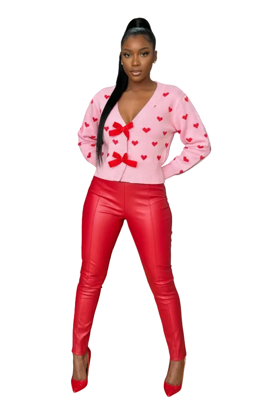 This adorable Love Me Sweater is made from extra soft material, perfect for staying cozy and comfortable during the colder months. The short pink cardigan features a deep v neckline and cute red hearts for a playful touch. With a bow snap closure, this sweater is both stylish and perfect for Valentines ❤️