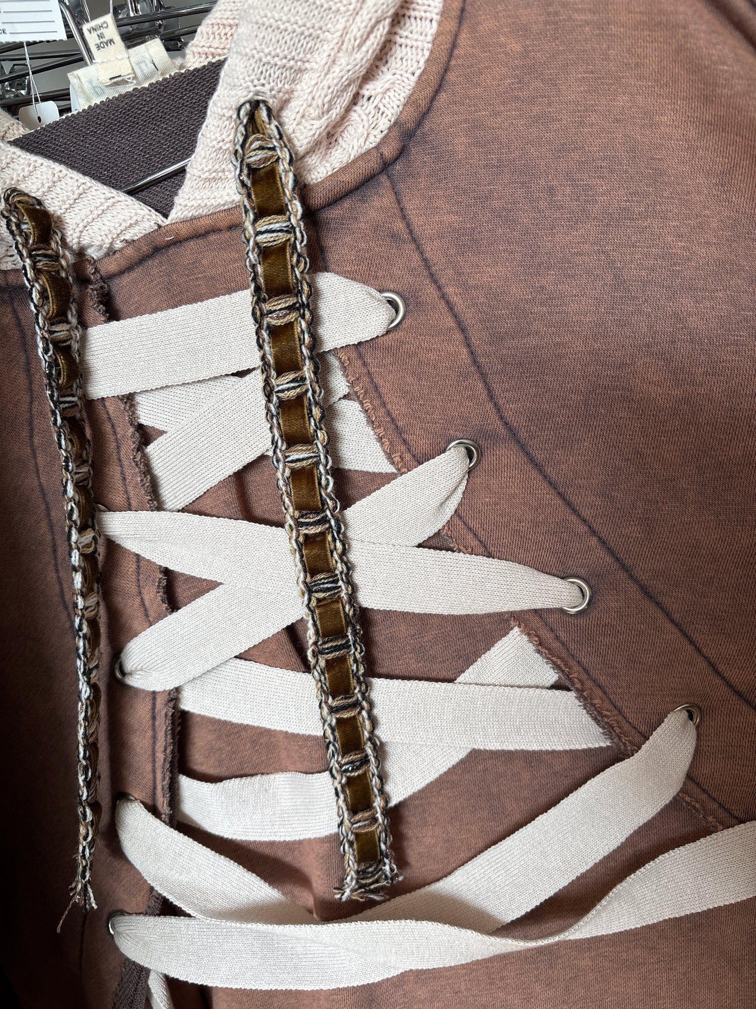 This Laced Up Sweatshirt blends the casual comfort of a sweatshirt with the cozy warmth of a sweater. Crafted from French terry fabric, it features a relaxed fit and stylish lace-up detail on the sleeves, adding a modern twist. The hood enhances its laid-back appeal, while the mixed materials provide texture and visual interest, making it an effortlessly chic choice for everyday wear.