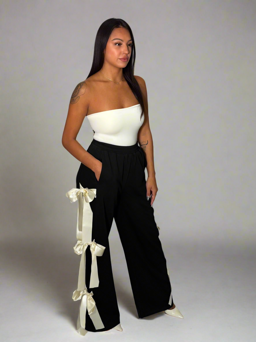 These Bow Tie Sweatpants offer both comfort and style with elegant satin bows on the sides. The elastic waist allows for a relaxed fit, making them perfect for a girly yet fashionable look. Stay comfortable and chic throughout the day with these fun sweatpants.