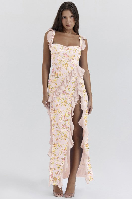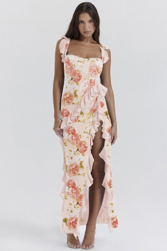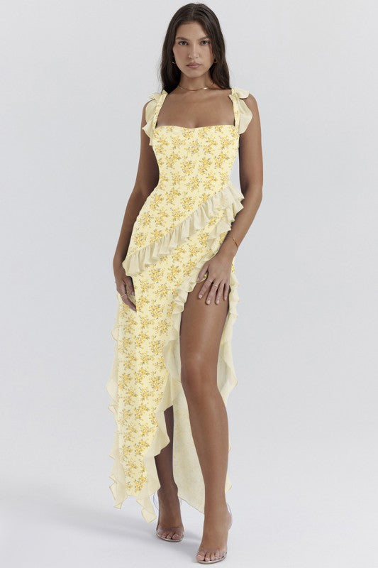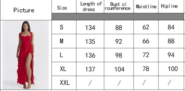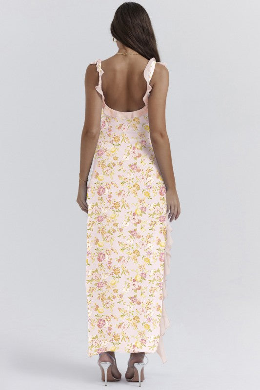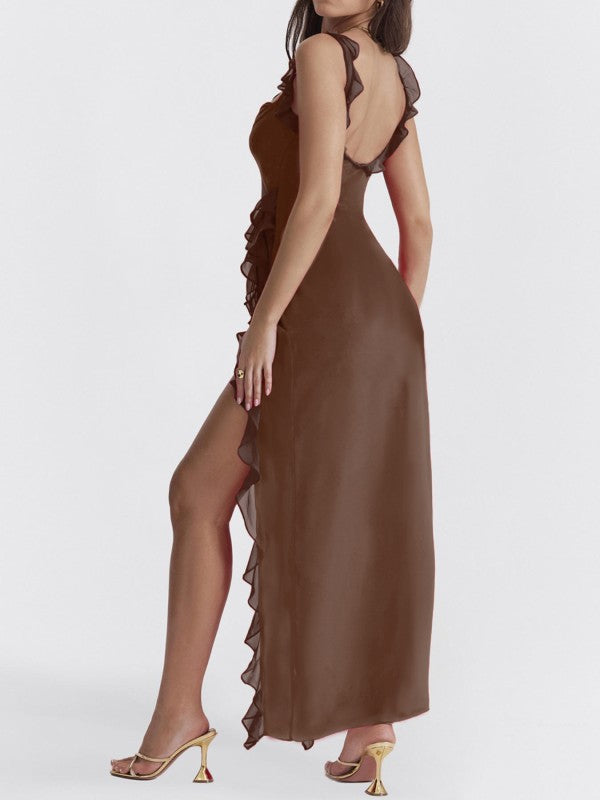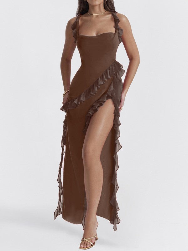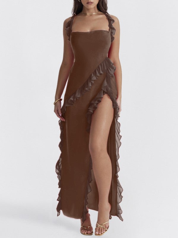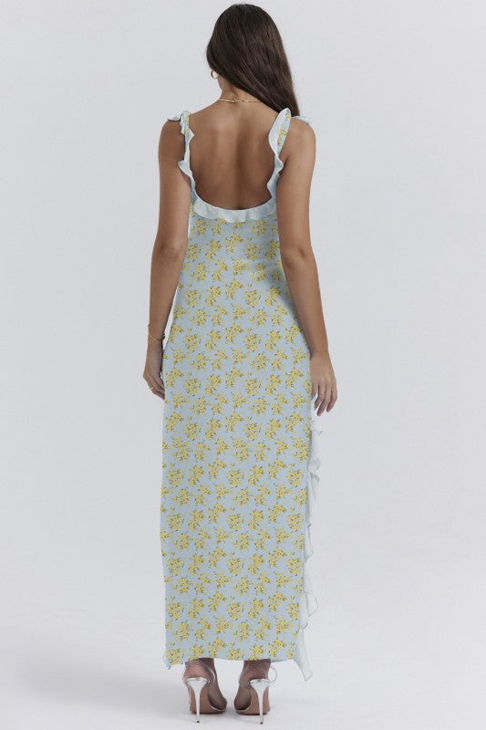 Get ready to turn heads and strut your stuff in the Alverra Maxi Dress! With wide straps and a sassy high slit, this backless beauty is the perfect summer sidekick for your high heels or laid-back sandals. Ruffles? Check! Pleats? You bet! Wearing this dress might just make you feel like a runway model or at least the star of your own fashion show!